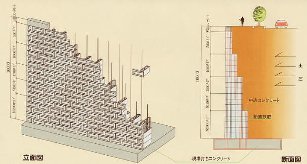 擁壁の壁部分にゴールコンブロックを使用し、基礎コンクリートに定着させた鉛直鉄筋とゴールコンブロックを中込めコンクリートにより一体化させることにより、鉄筋コンクリート擁壁と同等の安全性と構造性能をもち経済性と施工性のよい、自由な景観を実現できる擁壁として誕生しました。